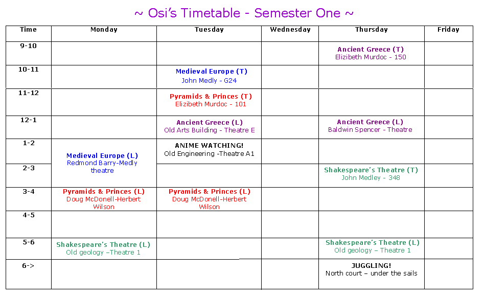 Yes, there are a few timetable changes so, like the sweet, considerate Osi that I am, I'm letting the whole world know! Yes, for your stalking benifit, no refunds. XD I've come to the conclusion that an update of this layout is seriously needed, though I have no program on this laptop on which to make such a change with. This must be remedied. Well, at least I can edit the picture, right? >.> <.<